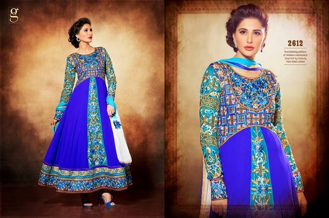 Most women love to wear carnival attires specially Shalwar Kameez (شلوار کمیز) with the coordination of expensive accessories. Here on Fashion Hunt World we have brought a breathtaking cultural dress collection for the coming Eid Occasion. In this Glossy Nargis Fakhri Eid Collection 2014, you can find Indias best designer suits included floral thread embroidered frocks, dual color shaded anarkali suits, trendy designer suits and much more. Hope this collection is favorable for your Eid Festive Wardrobe.