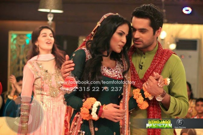 Shaista Lodhi is looking fabulous in peach coloured Georgette anarkali style frock. You can also seen the complete wed dance performance which is arranged by shows organizers. The famous fashion designer Saim Ali aso attend this show during the mehndi ceremony of Veena Malik. We don't take your much time, let's have a closer look at complete pictures of Veena Malik Mehndi-Wedding Function at Utho Jago Pakistan.